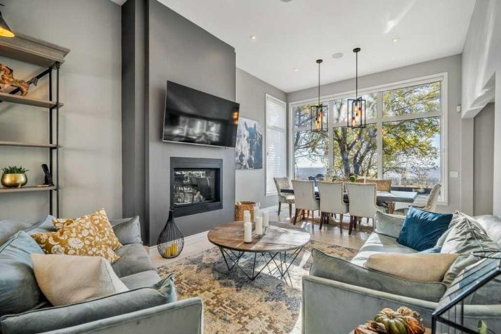 **Open House: Sun, Oct 19th 2 – 4PM** Commanding attention with breathtaking mountain, city & foothill views, this exquisitely renovated executive residence delivers nearly 5,000 sq ft of developed living space designed for comfort, sophistication & seamless technology. Meticulously upgraded with over $500,000 in premium enhancements, this luxury home combines modern innovation with timeless craftsmanship. A $140K Elan Smart Home Automation system with CAT 5 wiring, integrated sound & full control from any device sets the stage for effortless living. The impressive open-to-above foyer introduces elegant flow through the vaulted living room, where a sleek gas fireplace sets a sophisticated tone. Oversized windows in the adjoining dining area frame endless west-facing vistas, while designer lighting creates a refined backdrop for entertaining. The chef’s kitchen is a true centerpiece, blending luxury & function with granite countertops, high-end cabinetry, Sub-Zero & Wolf appliances, Miele built-in coffee maker, Asko dishwasher & an expansive island ideal for entertaining. A sunroom encased in glass brings the outdoors in, capturing panoramic ridge views year-round. This newly renovated space features heated floors & modern windows for year-round comfort, while patio doors extend living to the upper BBQ deck with glass railings & natural gas hookup for effortless entertaining. A stylish den with its own gas fireplace creates a serene home office. Completing the main level are a custom mudroom with storage lockers, laundry with ample storage & a sink & a handy powder room. Upstairs, a skylit hallway leads to the serene primary retreat where corner windows showcase sweeping views. A custom California Closet & spa-inspired 5-piece ensuite with in-floor heat, deep soaker tub, dual vanities & oversized rain shower enhance daily indulgence. A second bedroom enjoys its own private 3-piece ensuite, while two additional bedrooms share access to another full bathroom. Gather in the rec room in the walkout basement & enjoy family movies & games nights. A luxurious guest suite features in-floor heating, a gas fireplace, 3-piece ensuite, walk-in closet & direct patio access creating a spa-like retreat. A dedicated gym & an additional full bathroom add flexibility, while a second laundry area & abundant storage enhance everyday convenience. Outdoor living shines with multiple spaces for relaxation & entertaining, including a hot tub deck for rejuvenating evenings, a covered patio from the walkout level & an expansive yard with a custom-built treehouse surrounded by unforgettable views. Additional highlights include a heated triple car garage with epoxy floors, built-in speakers on all three levels, upgraded Hunter Douglas blinds & a durable clay tile roof. Ideally positioned on the Edgemont ridge with quick access to Nose Hill Park, top-rated schools, shopping & transit, this home balances timeless design with modern luxury in one of northwest Calgary’s most coveted locations!