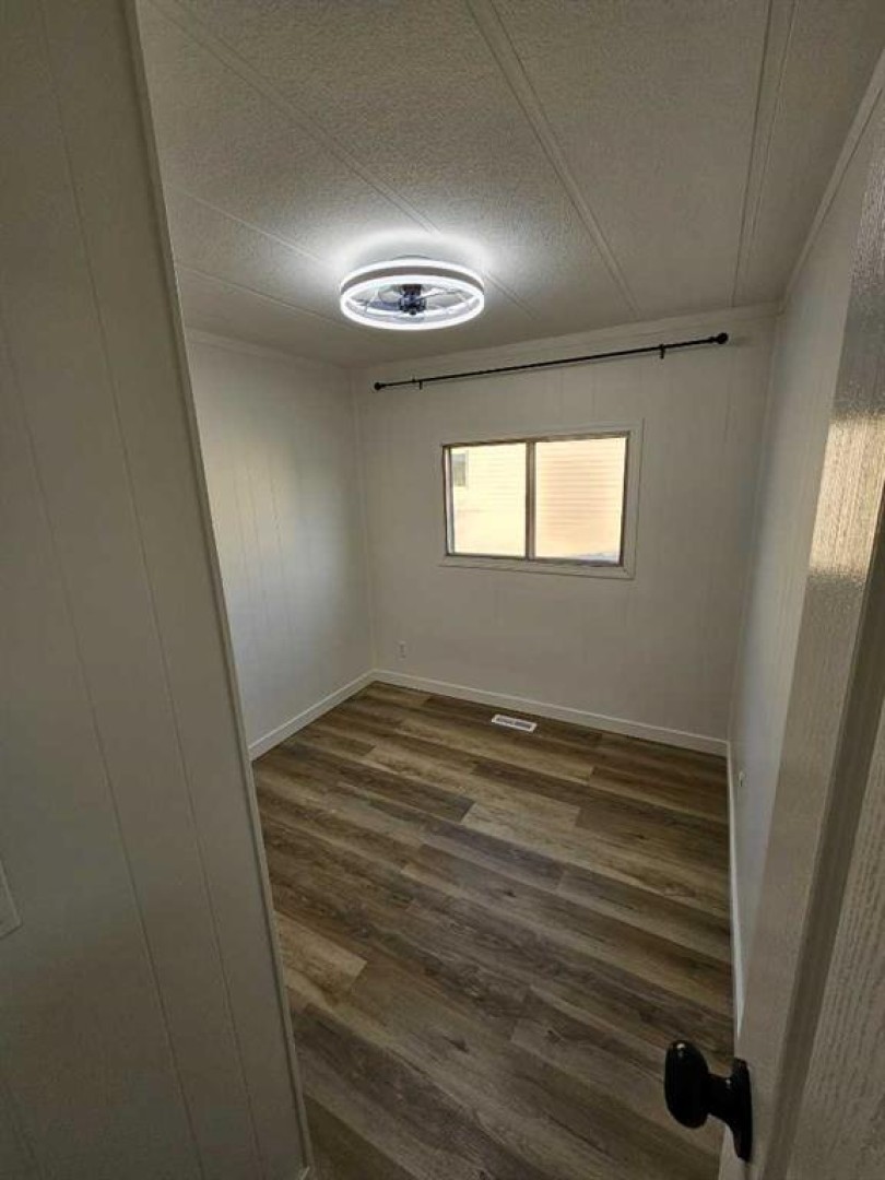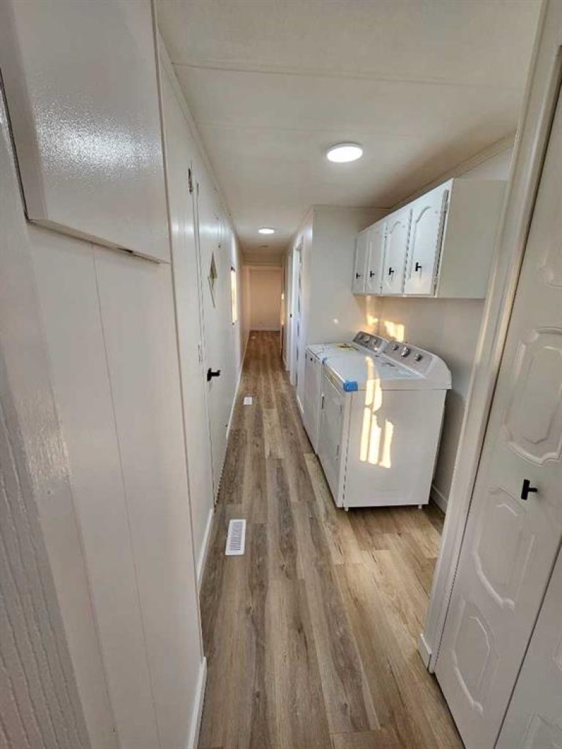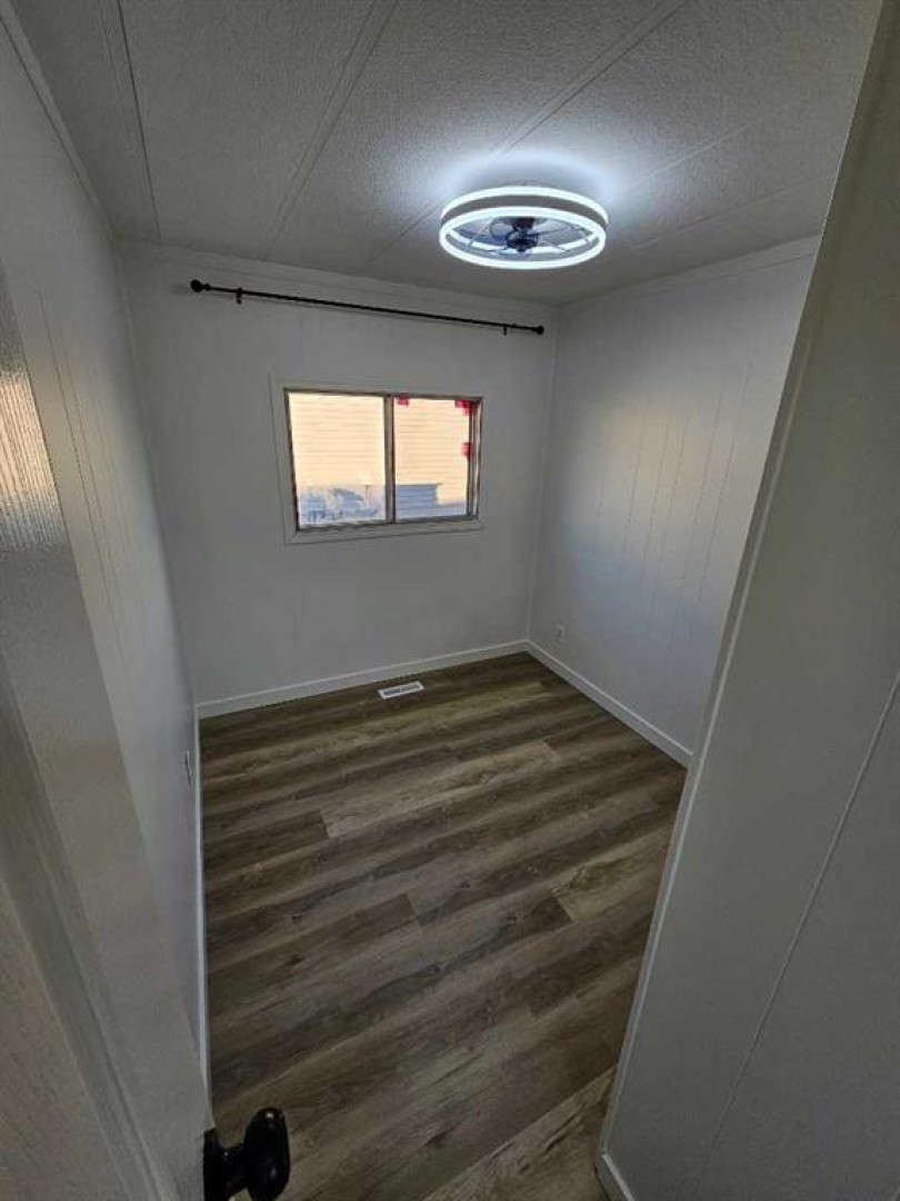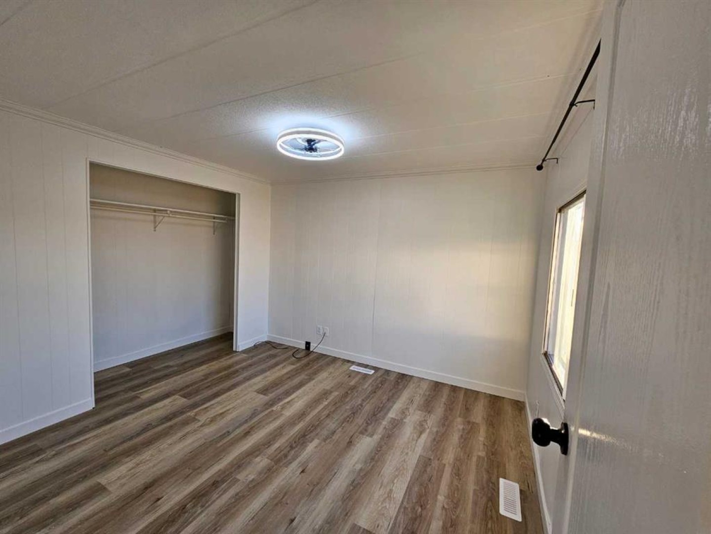 Beautifully updated mobile home with addition and covered deck at the end of a very quiet street in Coachman Village. Paved front parking leads to covered deck which provides shade in summer and shelter from snow at your door in winter. Approx. 8'x12' addition has shelving for shoes and a rack for coats and also has room for bench, coat rack, or more shelving if desired. Large bright kitchen has lots of counter space, a pantry, a peninsula eating bar, and a built in hutch. Living room is open and looks out to covered deck. Down the hall you'll find 3 bedrooms with ceiling fans, laundry, and bathroom with double sinks. No carpet - vinyl throughout. New fixtures throughout, skirting, eavestroughing, roof on addition, 2023 hot water heater, 2023 dishwasher, washer/dryer. No work needed here! Land lease is $593/month.